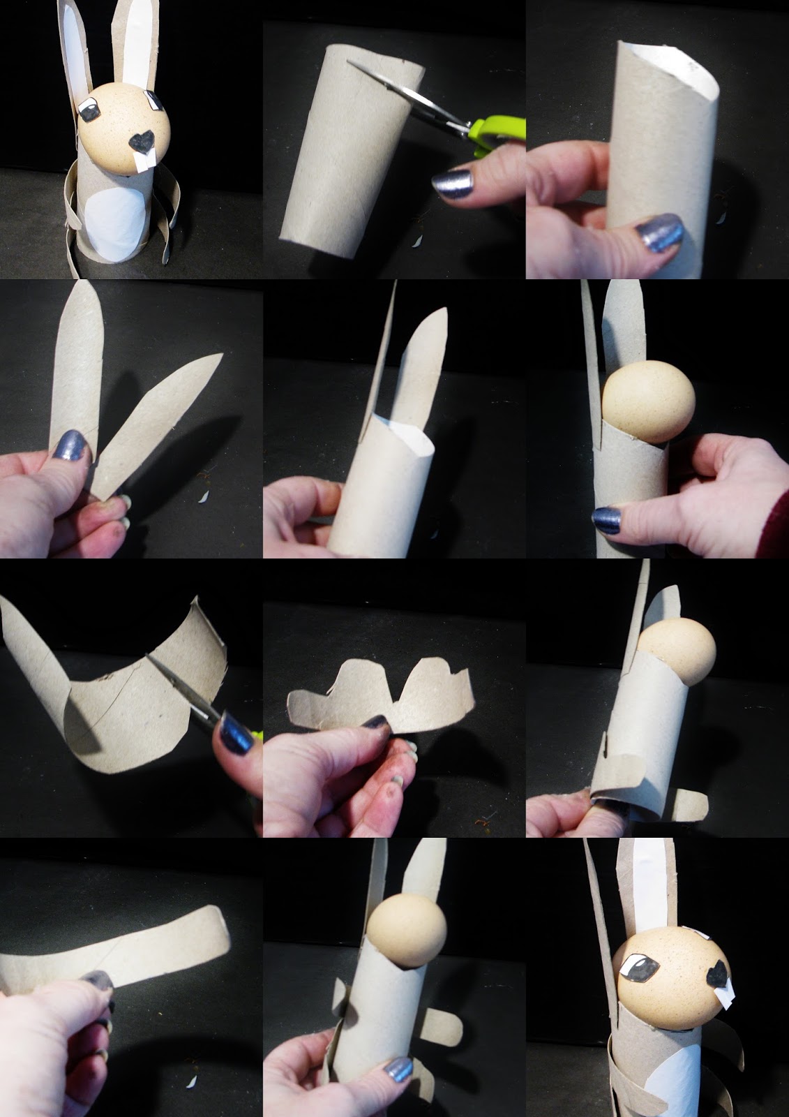 Górę rolki trochę podcinamy by wydmuszka dobrze pasowała. Z drugiej rolki wycinamy łapki. Dodajemy ogonek, oczki, ząbki i nosek. Ze zwykłej białej kartki owal na brzuszek i środki uszu.